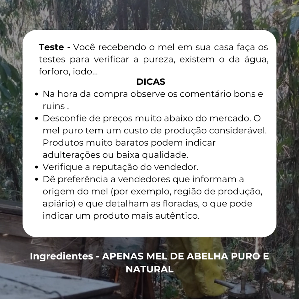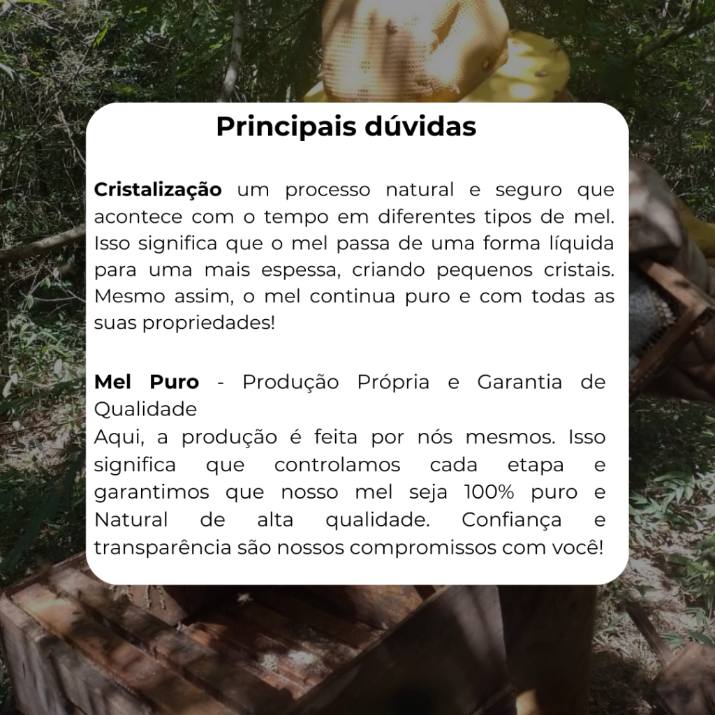 Mel 100% natural - do Apiário à mesa, sem intermediários - é fruto do nosso Apiário BOTTESINI, que tem 15 anos de experiência no manejo e extração de mel de forma sustentável. Praticamos apicultura de forma responsável, evitando áreas que empregam agrotóxicos, o que pode prejudicar a qualidade do mel, e outras que empregam diversos tipos de defensivos agrícolas que matam as abelhas e contaminam o mel.